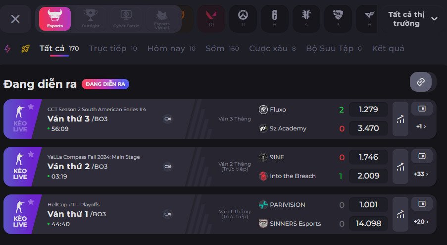 Sảnh game mang đến cho người chơi một giao diện cược hiện đại. Mỗi trò chơi được chia thành từng khu vực đặt cược riêng, giúp thành viên dễ dàng theo dõi và tham khảo kèo chơi nhanh chóng.