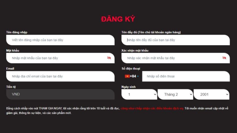 Khi đã vào đúng trang chủ, hãy chọn nút “Đăng ký” ở góc trên bên phải màn hình. Lúc này hệ thống sẽ hiển thị biểu mẫu yêu cầu nhập thông tin. Bạn cần điền đầy đủ và chính xác theo hướng dẫn sau: